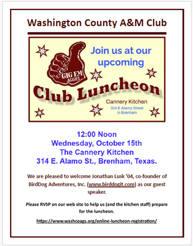 Cannery Kitchen 314 East Alamo, Brenham, TX, United StatesThe Washington County Ladies Lions will meet Monday, October 13 at Noon at the Cannery Kitchen. Members are reminded to bring a food item and used eyeglasses. The public is invited to attend; RSVP is not required . Lunch is available.